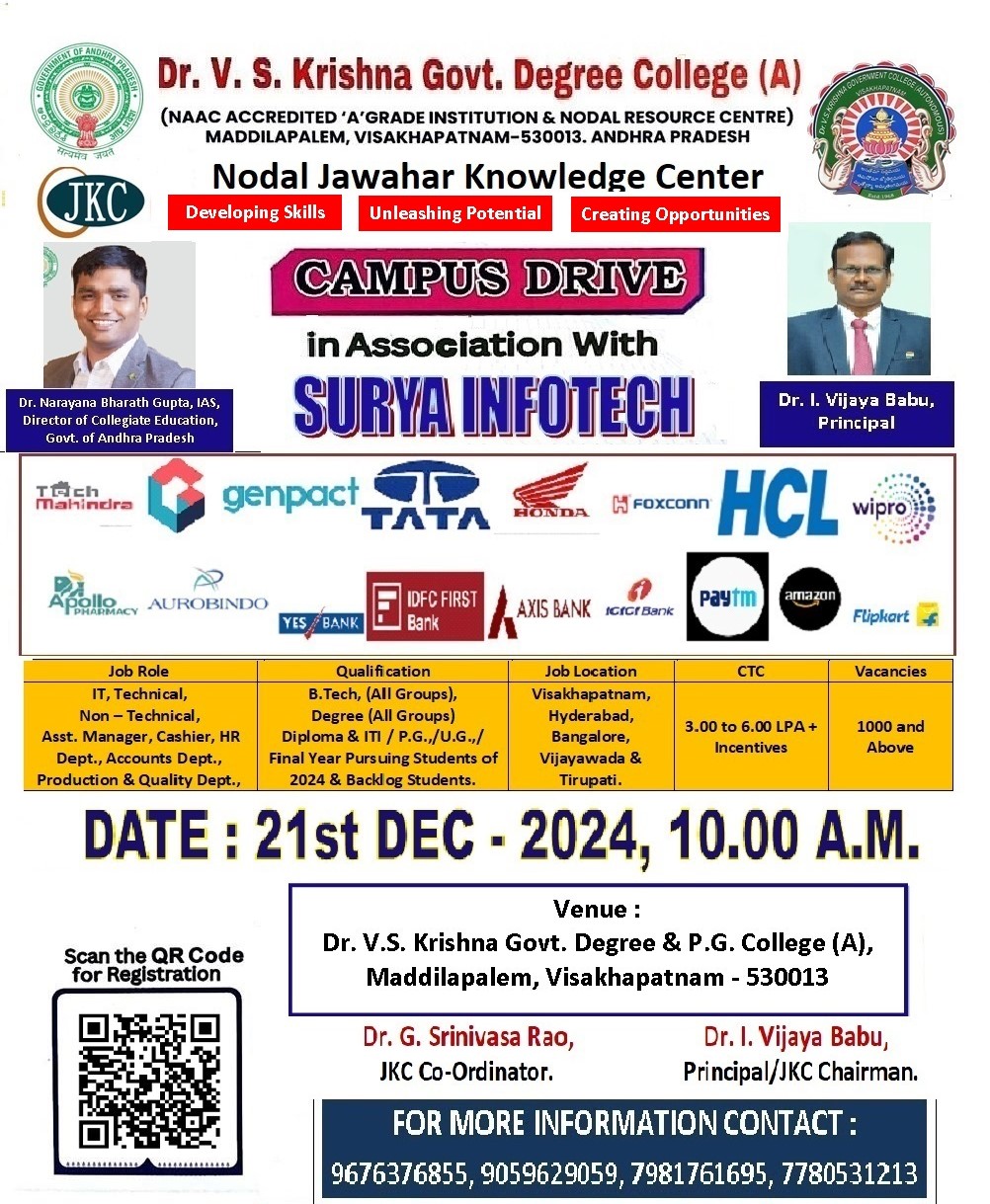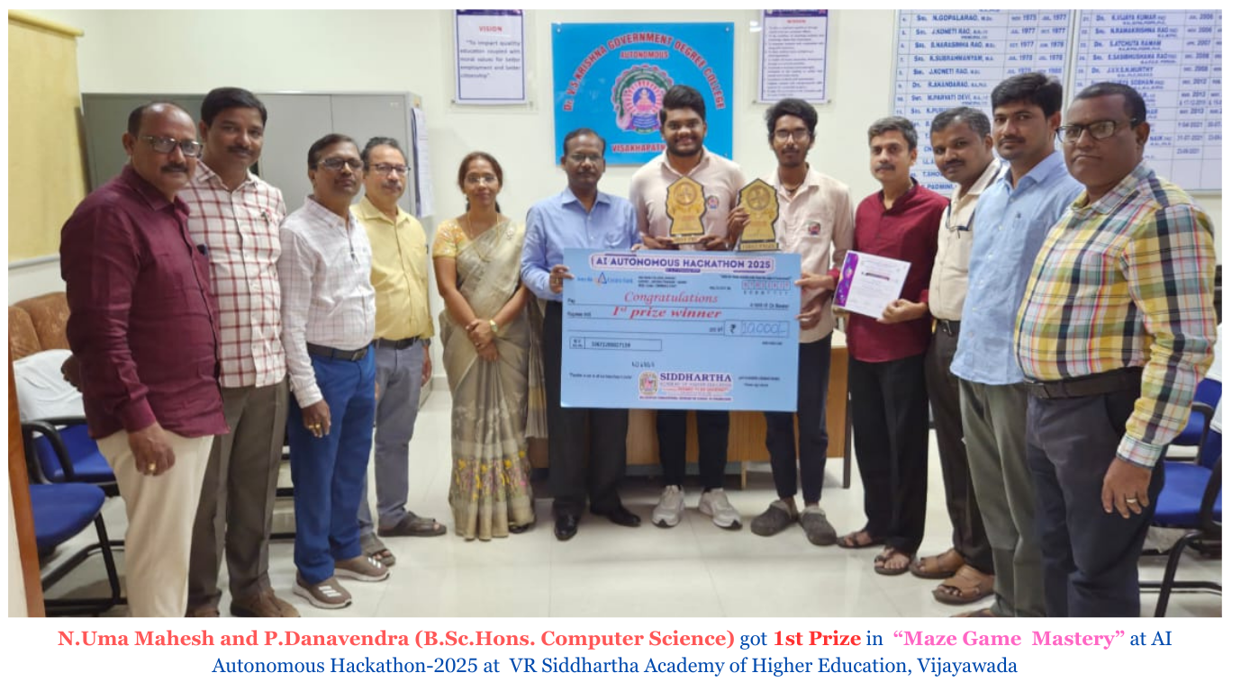 The college identified as Nodal Centre in the year 2005. The Research and Development Cell was established in the year 2010. The college was conferred autonomous status in the year 2011 and recognized as NRC in the year 2022. The college is offering both Under Graduate and Post Graduate Courses. Dr. V. S. Govt. Degree and PG College Government Degree College (A) is providing quality education for the urban and rural background students at an affordable cost. The college has strong technical team with expertise in Digital Teaching, Learning and Research.